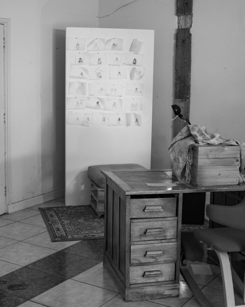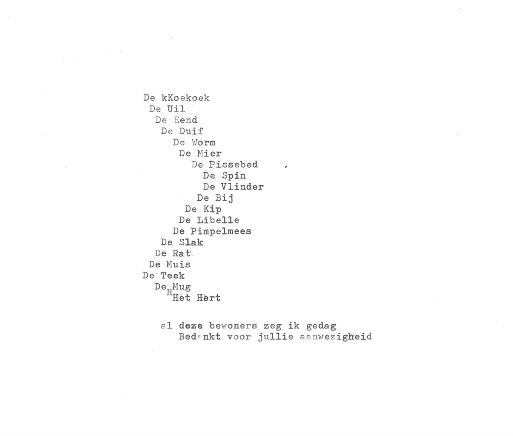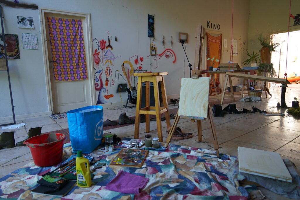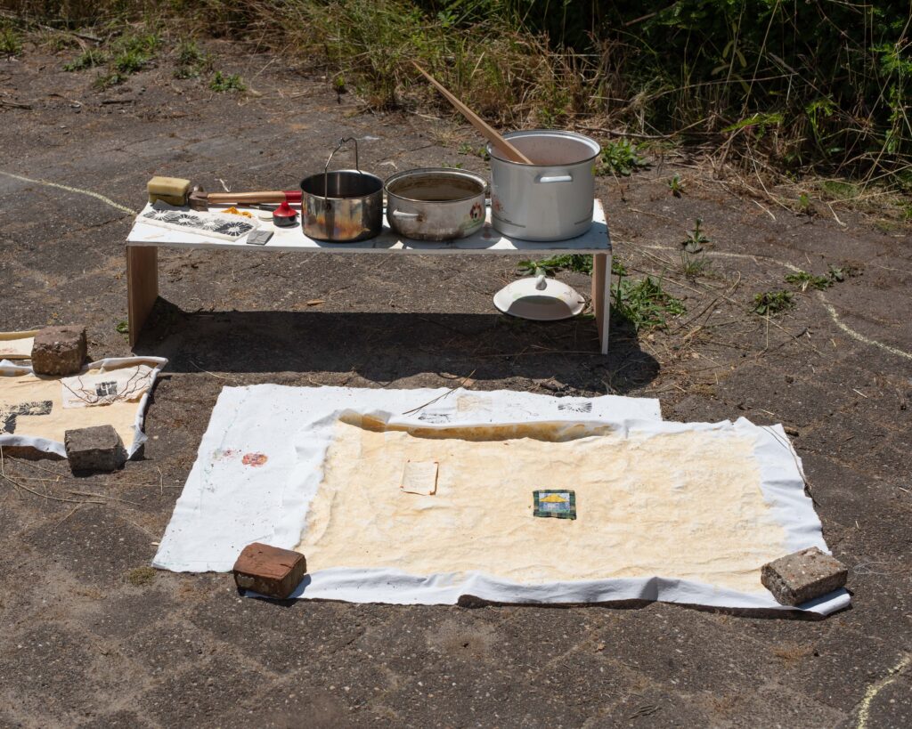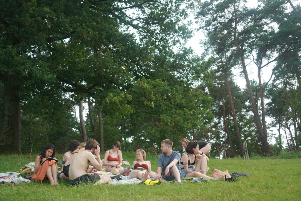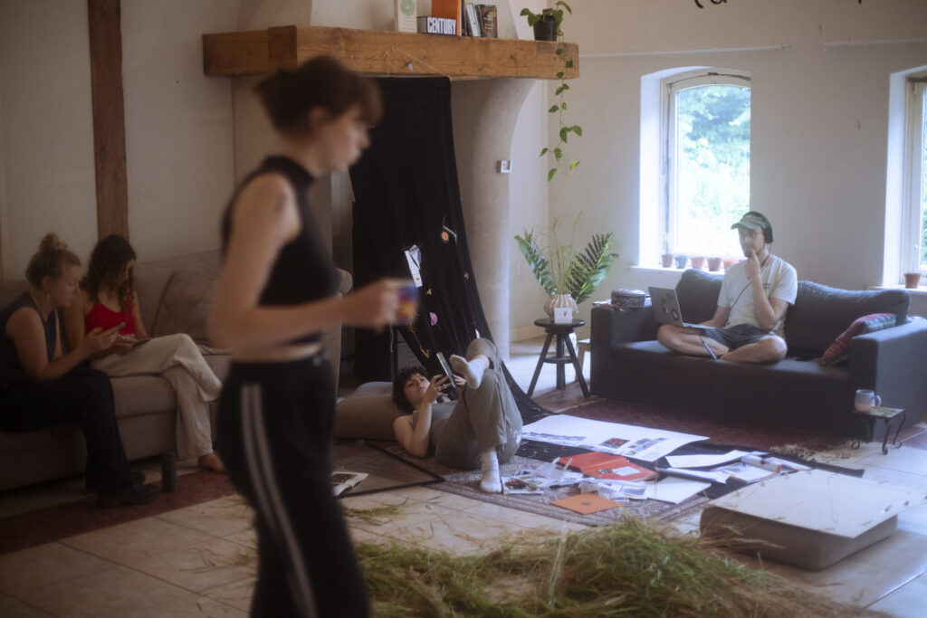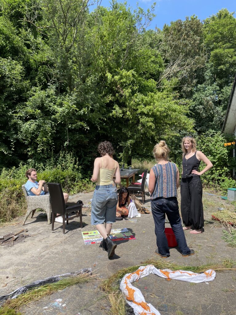 The Thunder Visit (2023) was the last event organised by De Nieuwkomers collective. It consisted of a 4 day collaborative residency with 12 artists, who joined at different times throughout the project. Forming a fluctuating collective for the duration of the residency, the participating artist not only responded to the space and each other through experimentation with multiple materials, but also found themselves forming a temporary household. Sharing rooms, meals, recipes, personal stories, book recommendations, art supplies and many precious moments. The residency included a philosophy masterclass by Roel Neuraij and an impromptu visit to the local lake for a cooling swim where a collective story was written on a typewriter.
